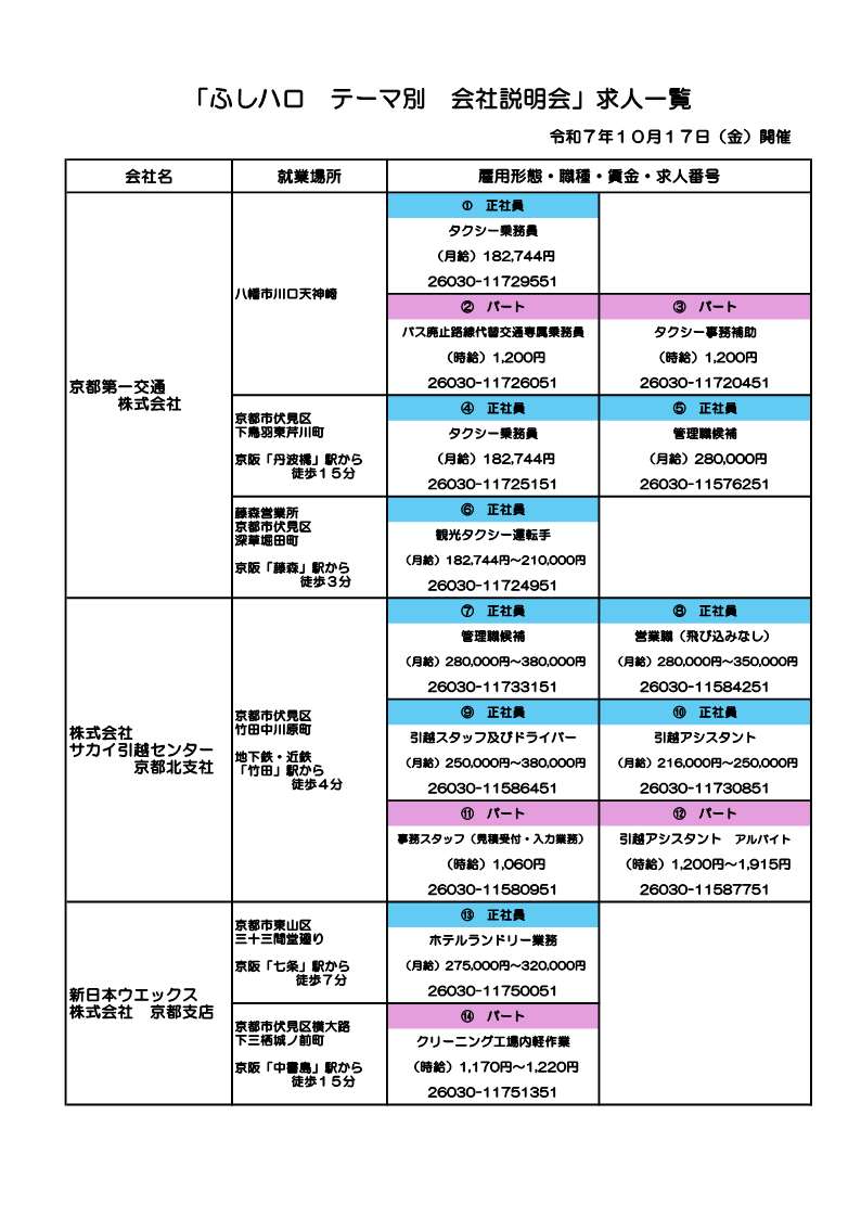 ハローワーク伏見による「テーマ別 会社説明会」を開催します。