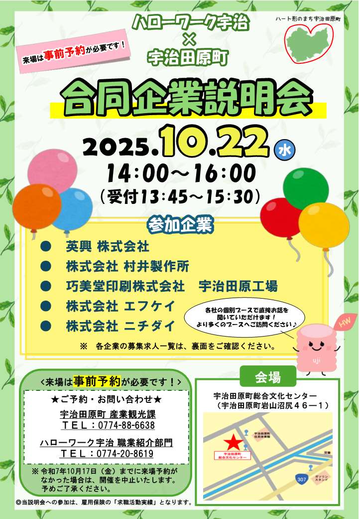 - 10月22日(水)ハローワーク宇治×宇治田原町「合同企業説明会」開催のお知らせ