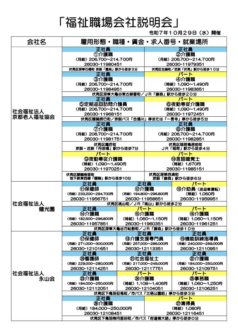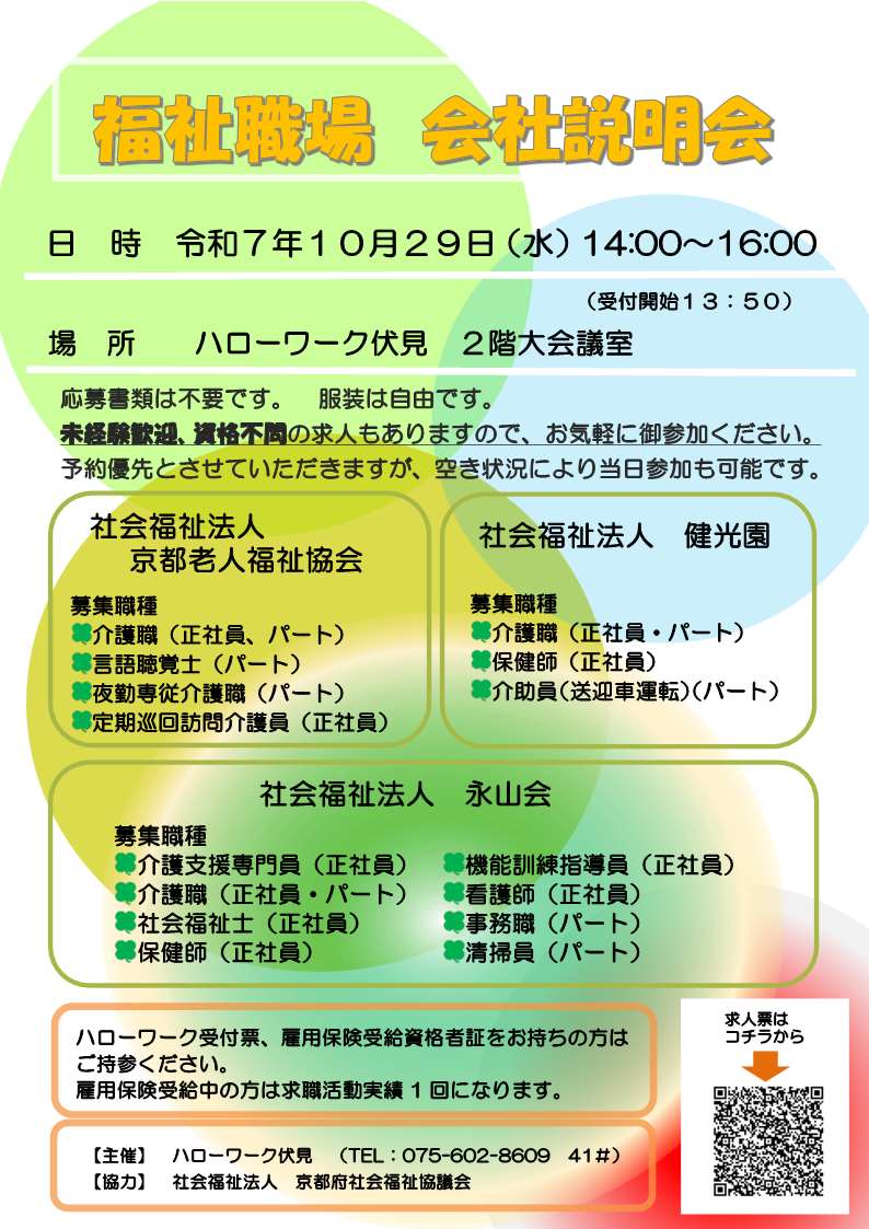 ハローワーク伏見において、以下のとおり参加企業3社による「福祉職場 会社説明会」を開催します。 日時:令和7年10月29日(水) 14:00~16:00(13:50から受付開始) 場所:ハローワーク伏見 2階 大会議室 企業名:社会福祉法人 京都老人福祉協会 :社会福祉法人 健光園 :社会福祉法人 永山会 募集職種:介護職 保健師 看護師 他