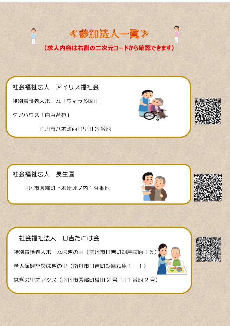 日時:令和7年10月30日(木)14時00分~16時00分 場所:ハローワーク園部 2階 会議室 事業所:社会福祉法人 アイリス福祉会 :社会福祉法人 長生園 :社会福祉法人 日吉たには会 対象者:介護・福祉職場へ就職を希望、または検討中の方