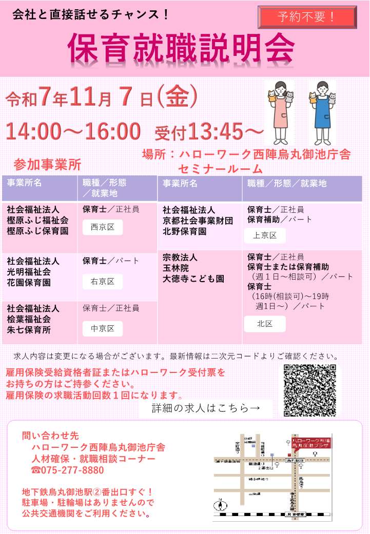 11月7日(金)ハローワーク西陣烏丸御池庁舎内セミナールーム「保育就職説明会」開催のお知らせ