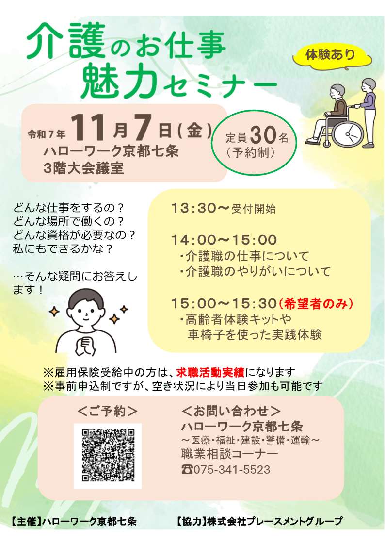 - 11月7日(金)ハローワーク京都七条で開催!✧✧介護のお仕事魅力セミナー✧✧✧