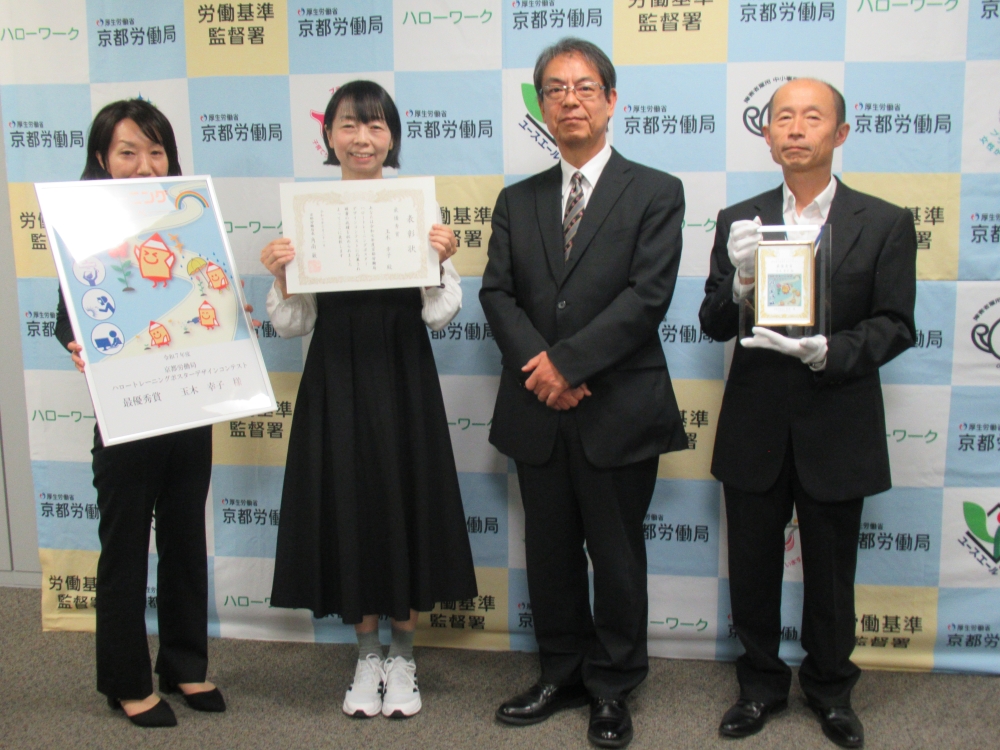 (左から)京都労働局職業安定部 渡部 部長 最優秀賞受賞 玉木 様 京都労働局 角南 局長 京都労働局職業安定部 北尾 訓練課長