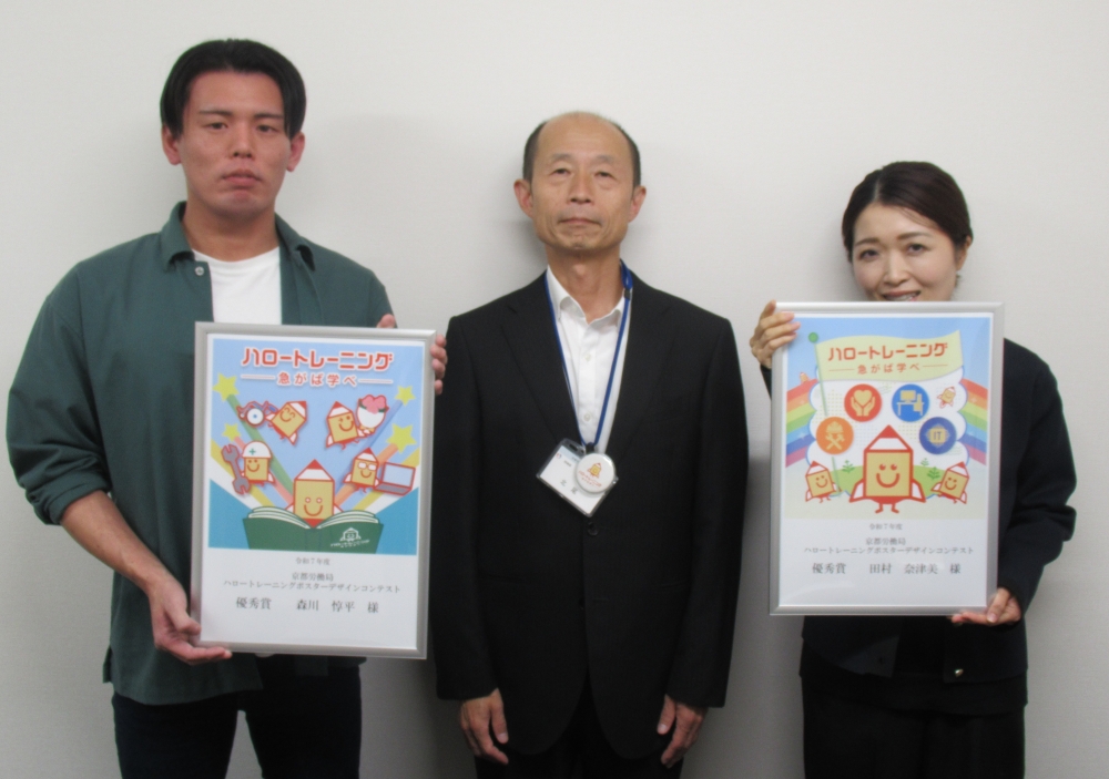 (左から)優秀賞受賞 森川 様 京都労働局職業安定部 北尾 訓練課長 優秀賞受賞 田村 様