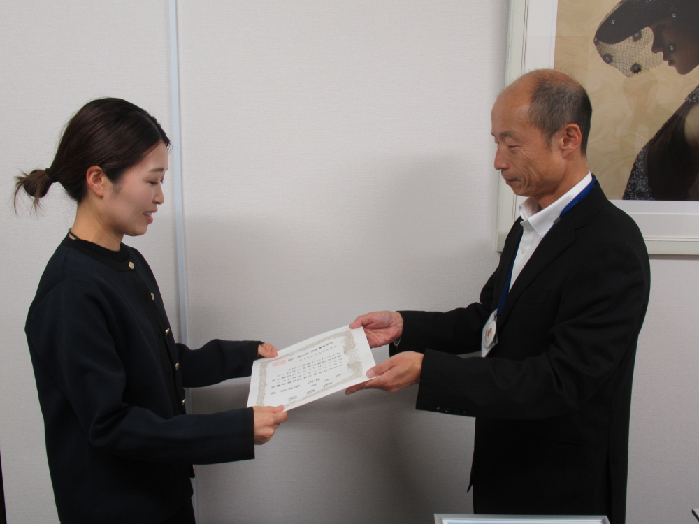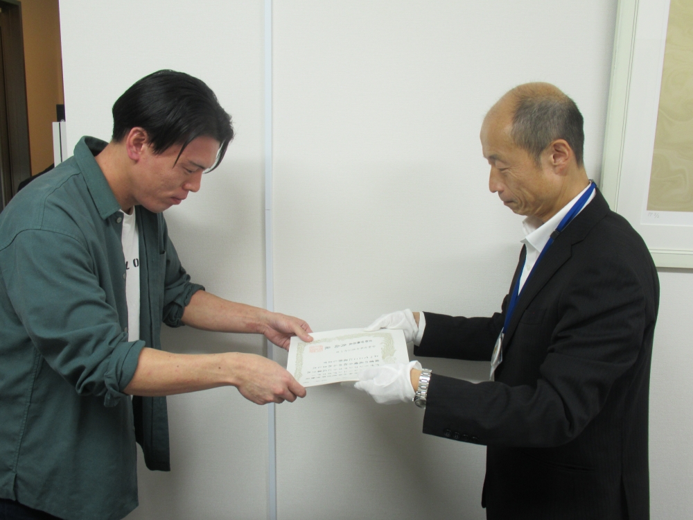 ②10月31日(金) 優秀賞の森川様と田村様が受講されている職業訓練コースの実施施設を訪問しました。授業終了後、表彰を行い、それぞれに表彰状、記念盾を授与しました。