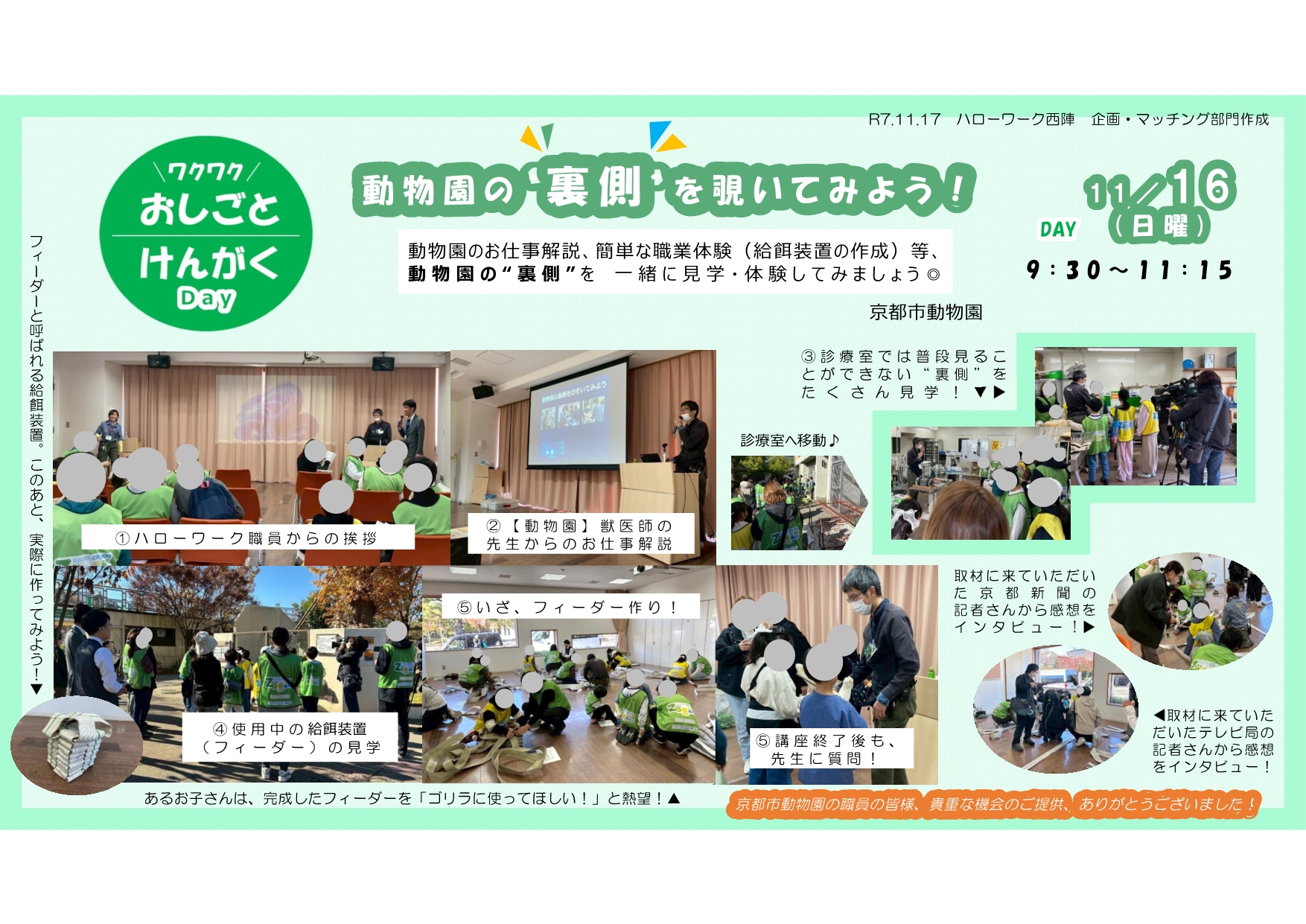 ハローワーク西陣では、京都市動物園とコラボし、小学生向けのキャリア教育イベント「動物園の“裏側”を覗いてみよう!」(おしごと けんがく Day)を開催しました。