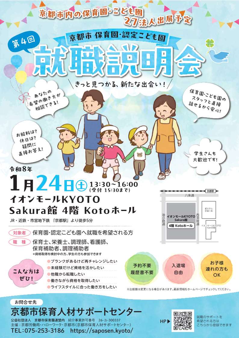 - 1月24日(土)「第4回 京都市 保育園・認定こども園就職説明会」開催のお知らせ(イオンモールKYOTO)