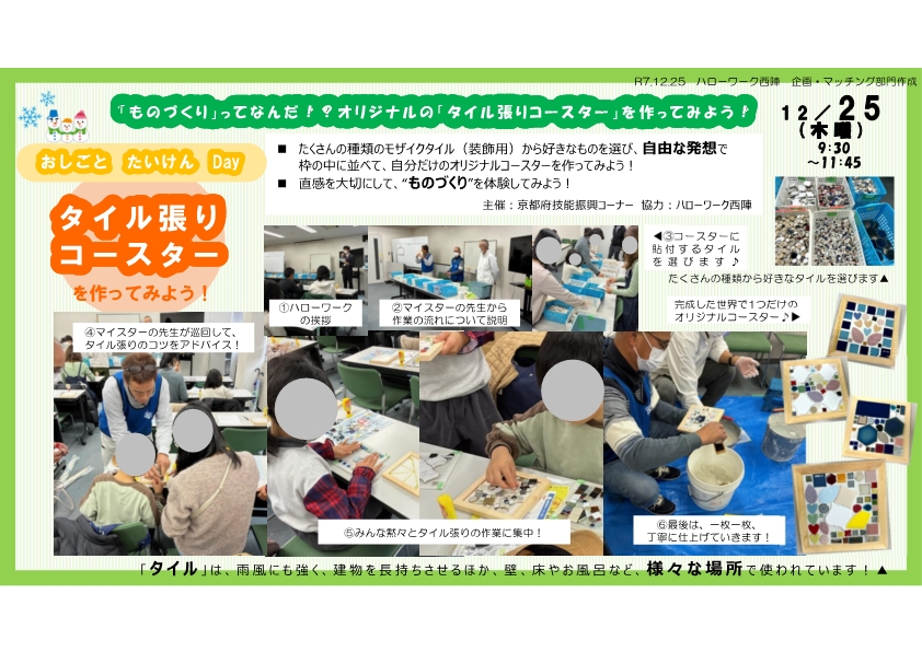 ハローワーク西陣では、小学4年生~6年生を参加対象として、「タイル張りコースター作り(おしごと たいけん Day)」を開催しました。