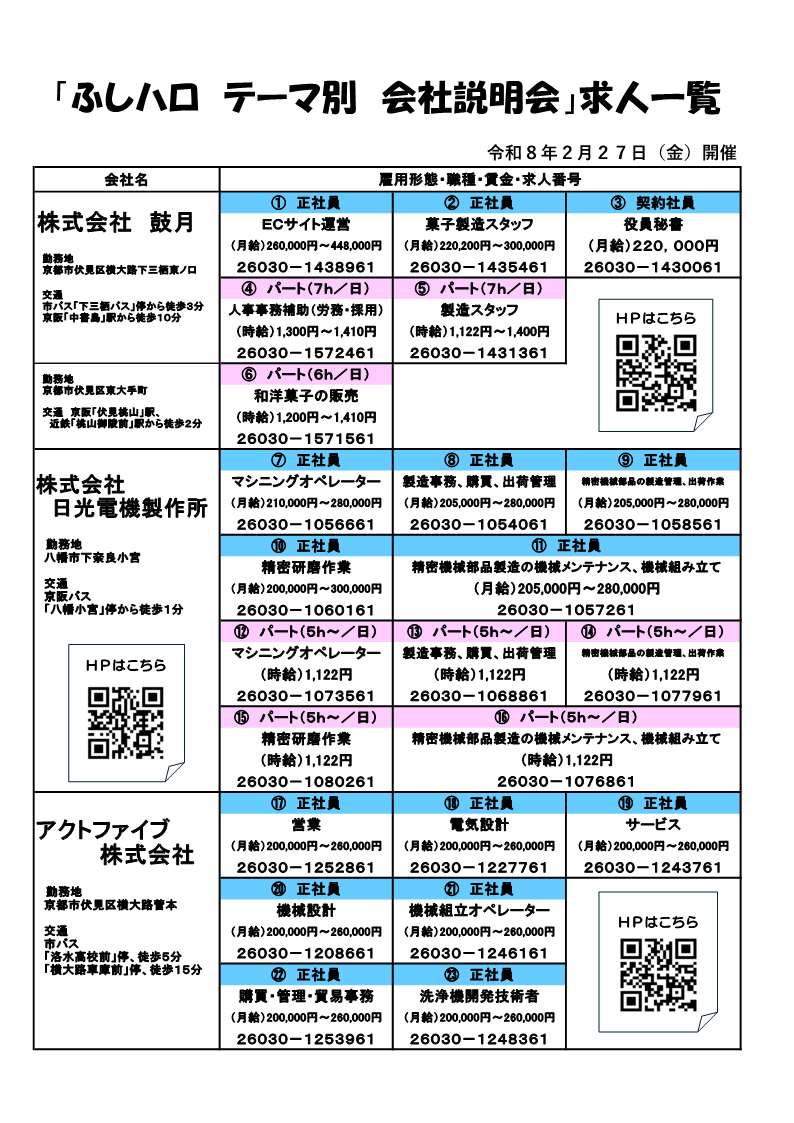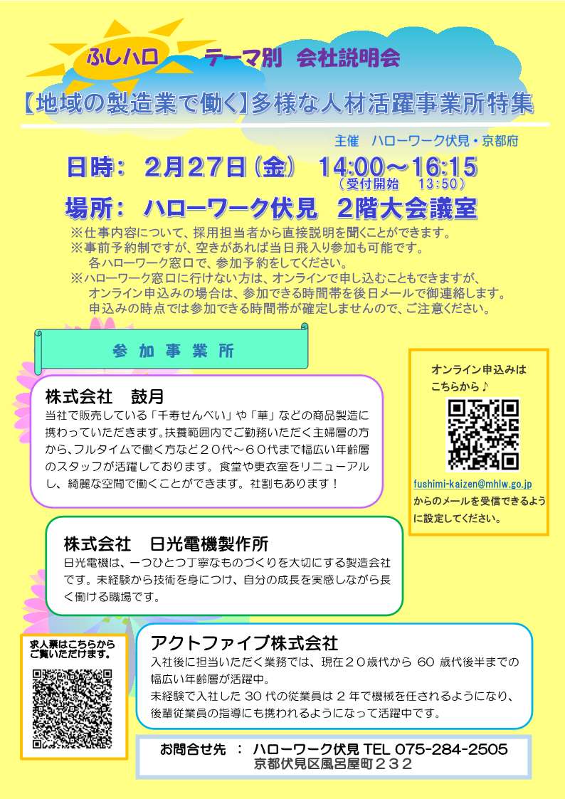 ハローワーク伏見による「テーマ別 会社説明会」を開催します。