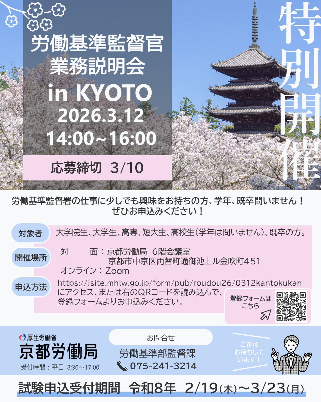 ①労働基準監督官業務説明会 ②京都労働局監督課 ③労働基準監督官の仕事に興味がある大学生、既卒の方 ④電話でお申込みください。 京都労働局監督課 075-241-3214 詳しくはこちら! |