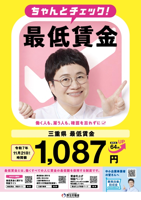 - 1087円/時間 令和7年11月21日 ~ 最低賃金に関するお知らせ