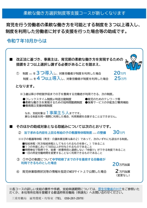 育児を行う労働者の柔軟な働き方を可能とする制度を3つ以上導入し、 制度を利用した労働者に対する支援を行った場合等に助成金を受給できます。