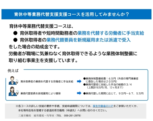 労働者が職場に気兼ねなく育休取得できるような業務体制整備に取り組む事業主を支援する助成金です。