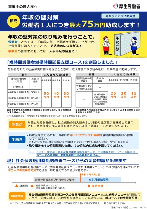 短時間労働者の処遇改善や人手不足の解消のために「年収の壁」対策を行う事業主をサポートします。(厚生労働省ホームページ)