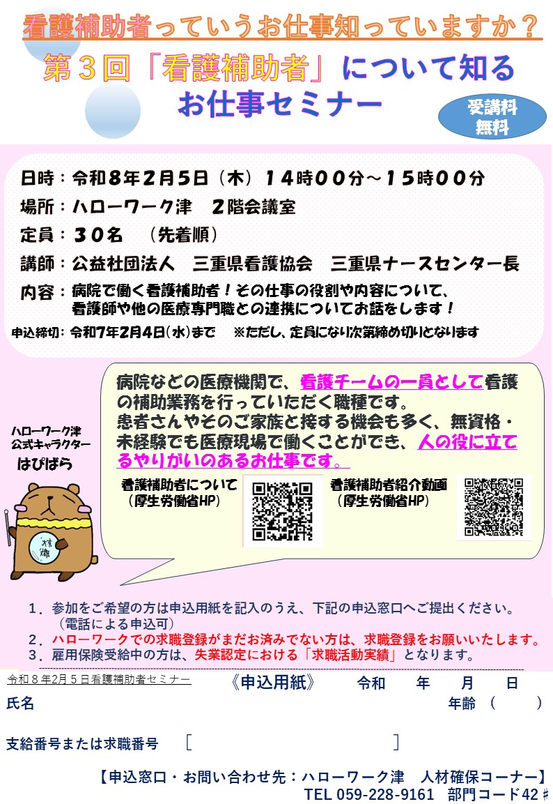 令和8年2月5日(木)14時00分~15時00分(受付:13時45分~14時00分)ハローワーク津2階会議室にて「看護補助者について知るお仕事セミナー」を開催します。