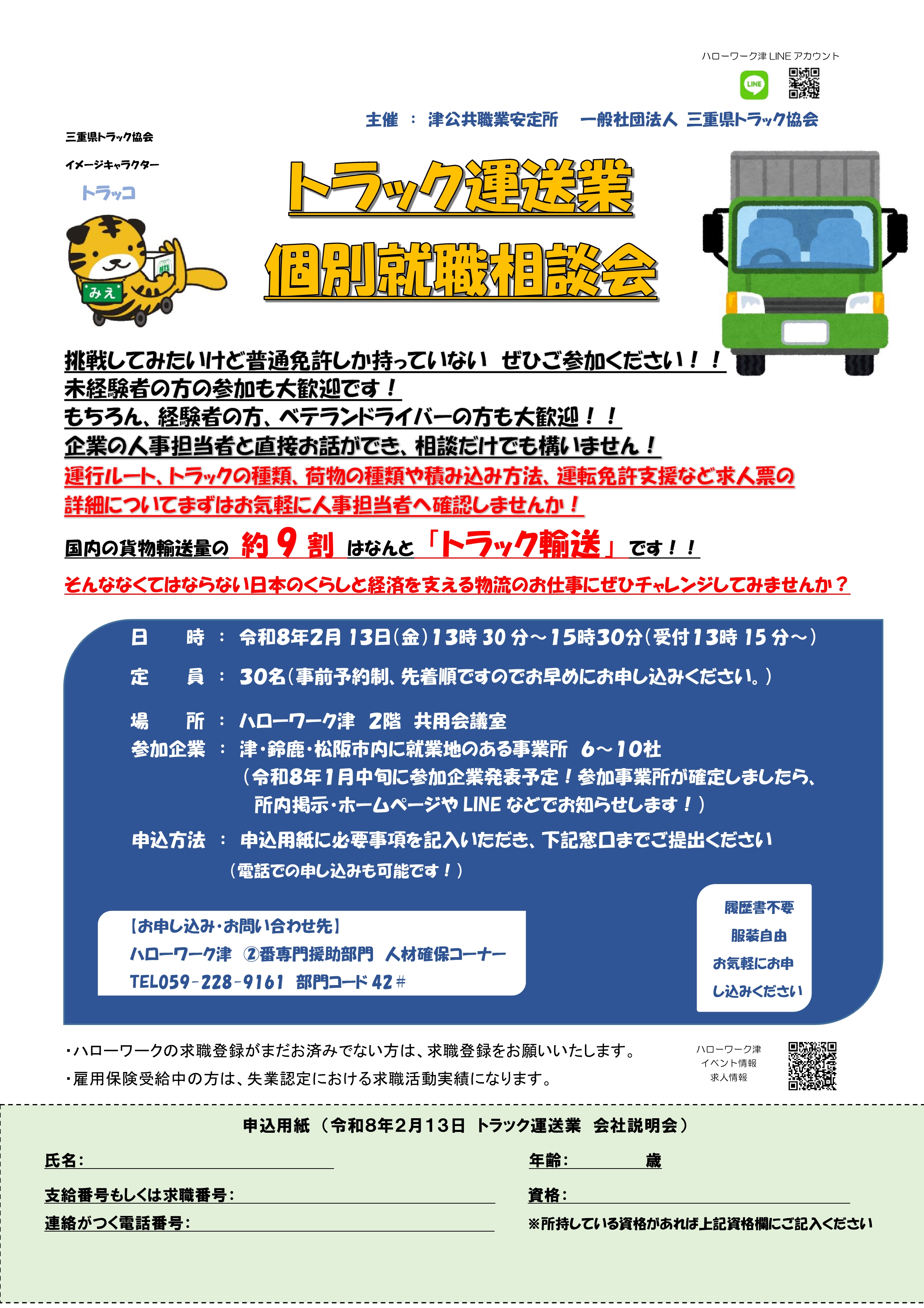 令和8年2月13日(金)13時30分~15時30分までハローワーク津2階会議室にてトラック運送業就職相談会を開催いたします。当日は津・鈴鹿・松阪に就業地のある事業所6~10社ほどの採用担当者がハローワーク津へお越しいただき、個別相談ブースにて求人票の内容やお仕事内容について相談することができます。ぜひ、求人票では分からない運行ルート、トラック・荷物などの種類や免許支援などについて確認して情報収集しませんか!
