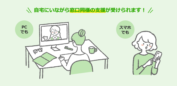 お持ちのスマートフォンなどを利用して、ご自宅や外出先などからハローワーク職員とオンライン(Zoom) で相談ができるサービスのことです。 ※ハローワークへの求職登録及びオンライン・ハローワークシステムの利用者登録が必要です。 ※Web カメラによる通信が可能な端末が必要です。