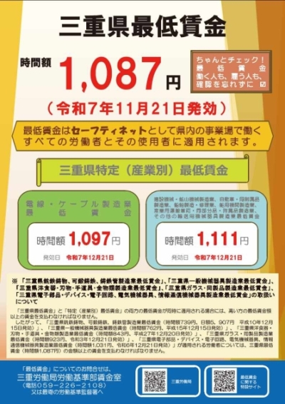 - 1087円/時間 令和7年11月21日 ~ 最低賃金に関するお知らせ