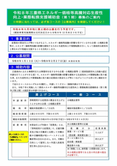 三重県|令和8年三重県エネルギー価格等高騰対応生産性向上・業態転換支援補助金(第1期)の公募について