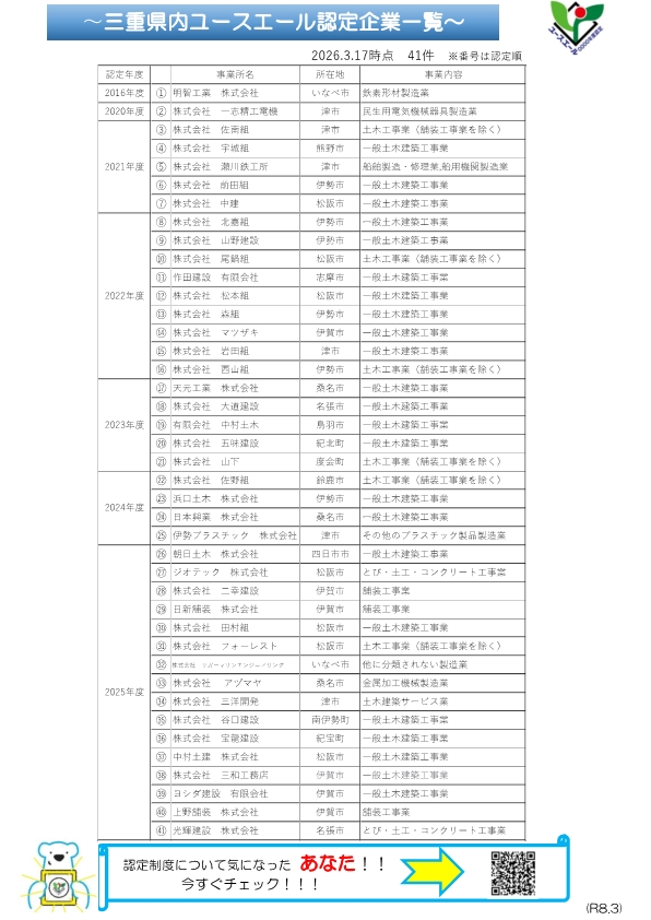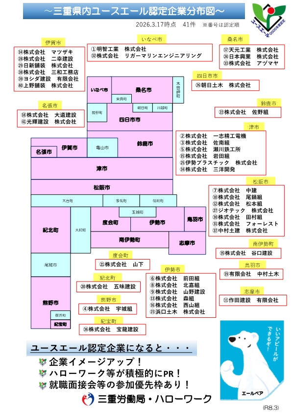 ↑三重県内の認定企業分布図です。※R8.3.17時点 41件