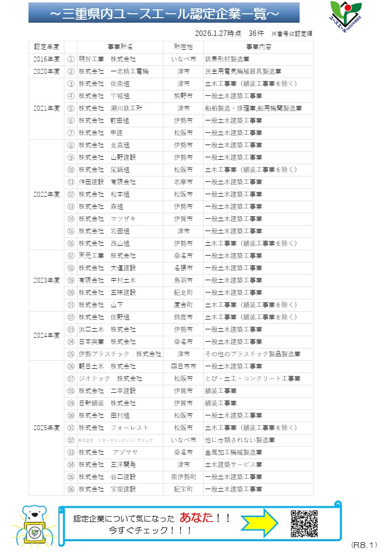 三重県内にはR8.1.27時点で36の認定企業があります。