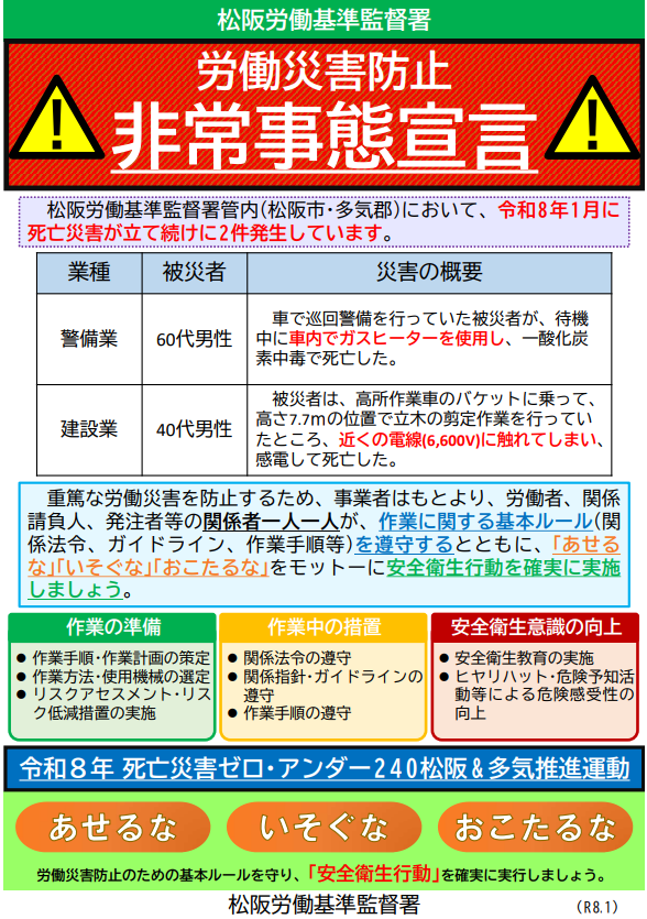 New!- 松阪労働基準監督署管内(松阪市・多気郡)において、令和8年1月に死亡災害が立て続けに2件発生しています。