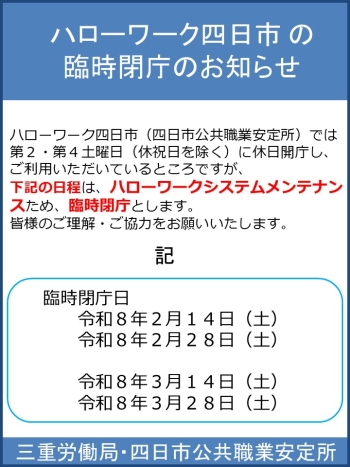 ●2月24日(火)生涯現役(65歳以上の方対象)企業説明会開催!(参加企業:三昌物産(株)、四日市ポートサービス(株)、(福)英水会、(合)天米堂)