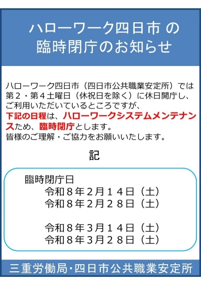 ハローワーク四日市(四日市公共職業安定所)において、以下のリーフレットに記載の日程については臨時閉庁いたします。来所相談の予約は承っていませんので、皆様のご理解・ご協力をお願いいたします。