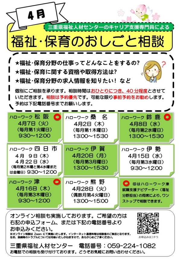 県内のハローワーク及び付属施設において、おおむね毎月1回程度、三重県福祉人材センターのキャリア支援専門員・保育専門相談員が、福祉・保育の仕事に関する出張相談を行っております。