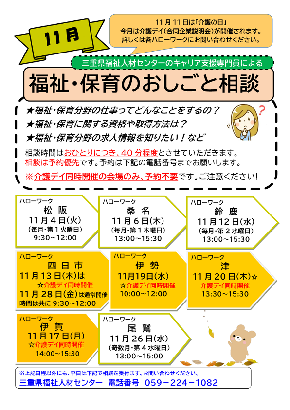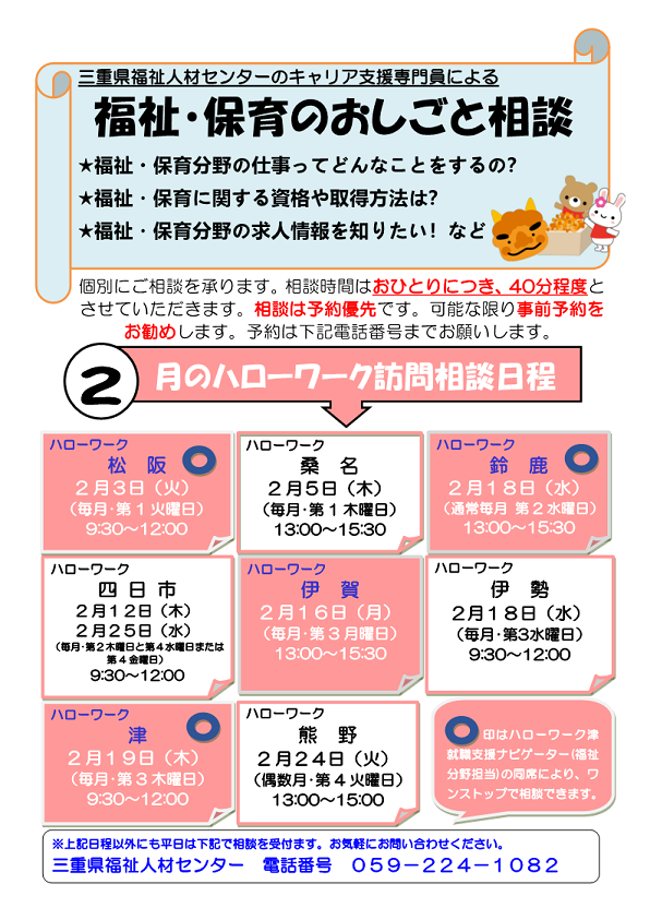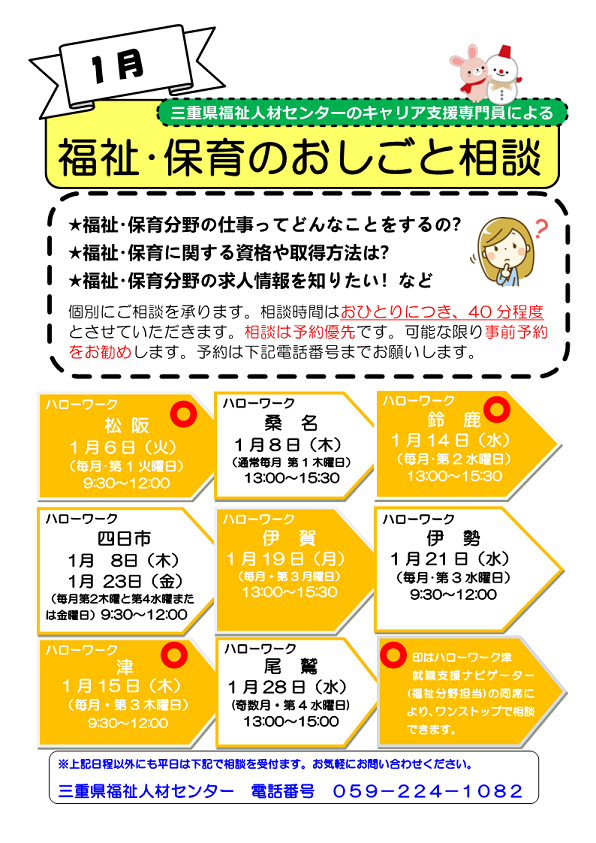 三重県福祉人材センターのキャリア支援専門員による個別相談が受けられます。