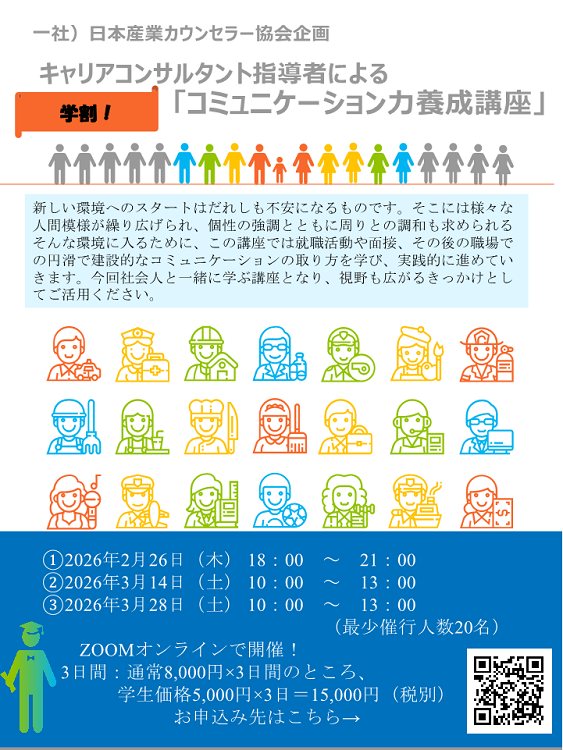 一般社団法人 日本産業カウンセラー協会が主催する本講座では、就職活動・面接、その後の職場で役立つコミュニケーションの取り方を、基礎から実践まで学び、身につけます。