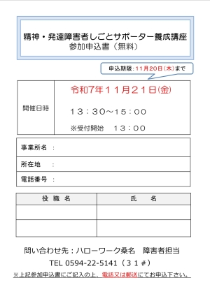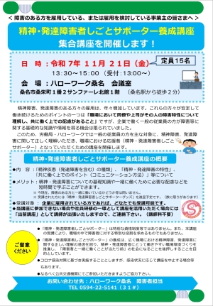 - 令和7年11月21日(金)精神・発達障害者しごとサポーター養成講座(桑名会場)を開催します!