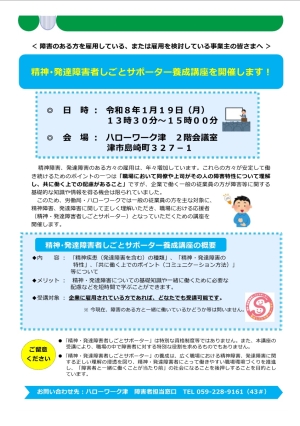 - 令和8年1月19日(月)精神・発達障害者しごとサポーター養成講座(津会場)を開催します!