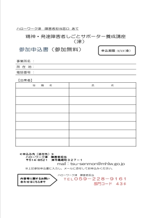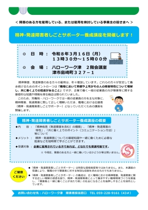 令和8年3月16日(月)精神・発達障害者しごとサポーター養成講座(津会場)を開催します!