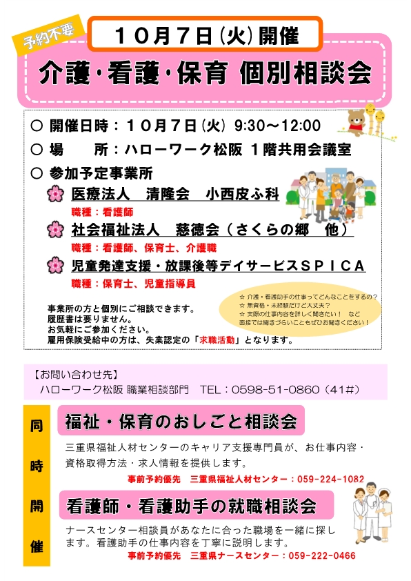 10月7日 介護・看護・保育 個別相談会 開催! 予約不要です!