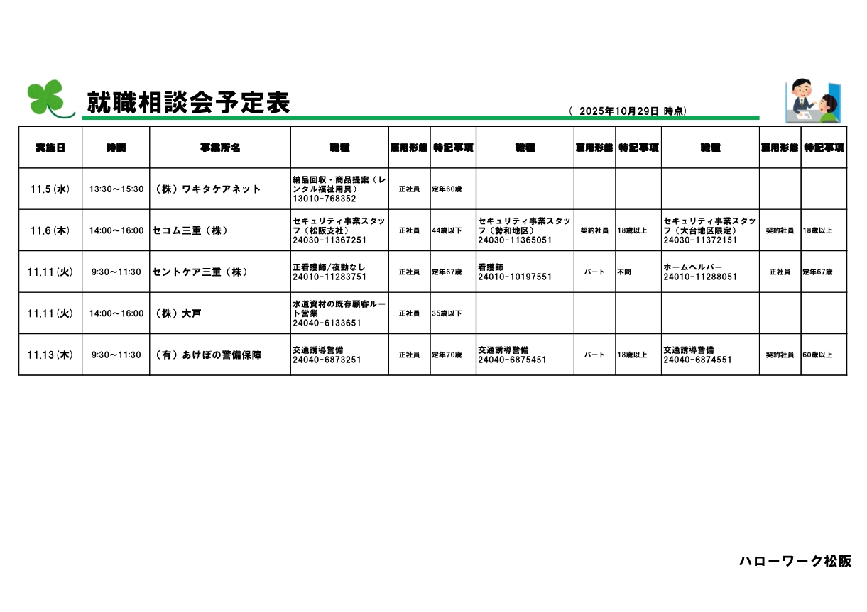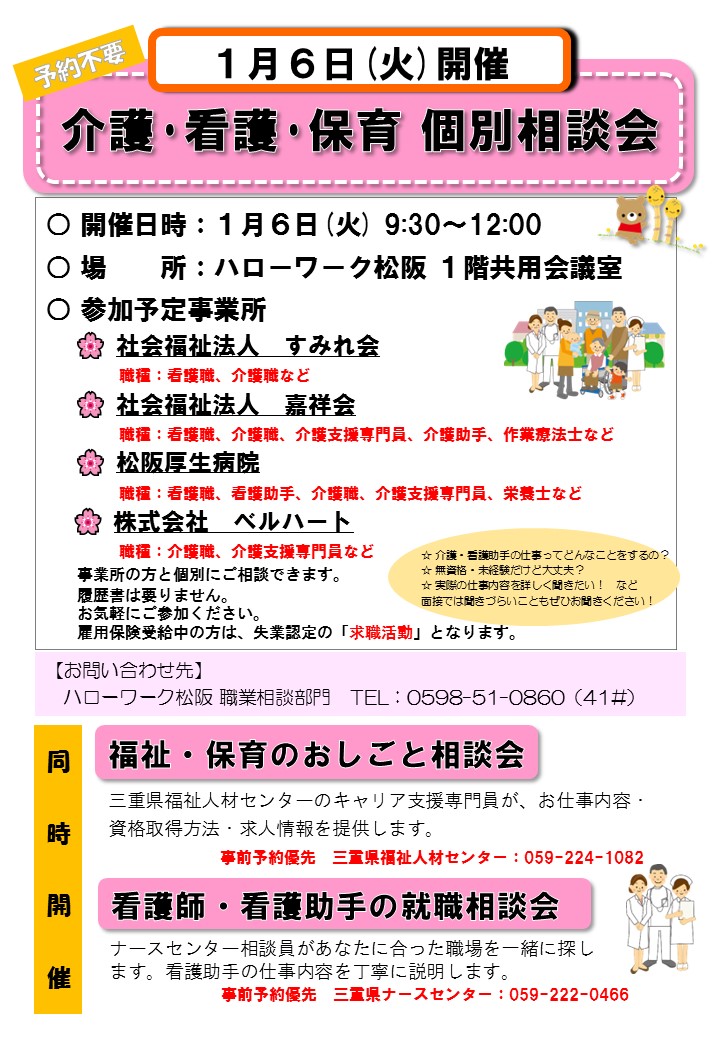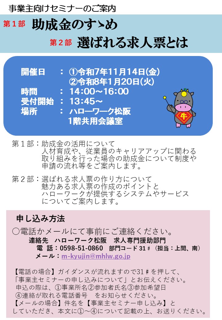 ご不明な点、お問い合わせは、ハローワーク松阪 求人・専門援助部門までお願いします。