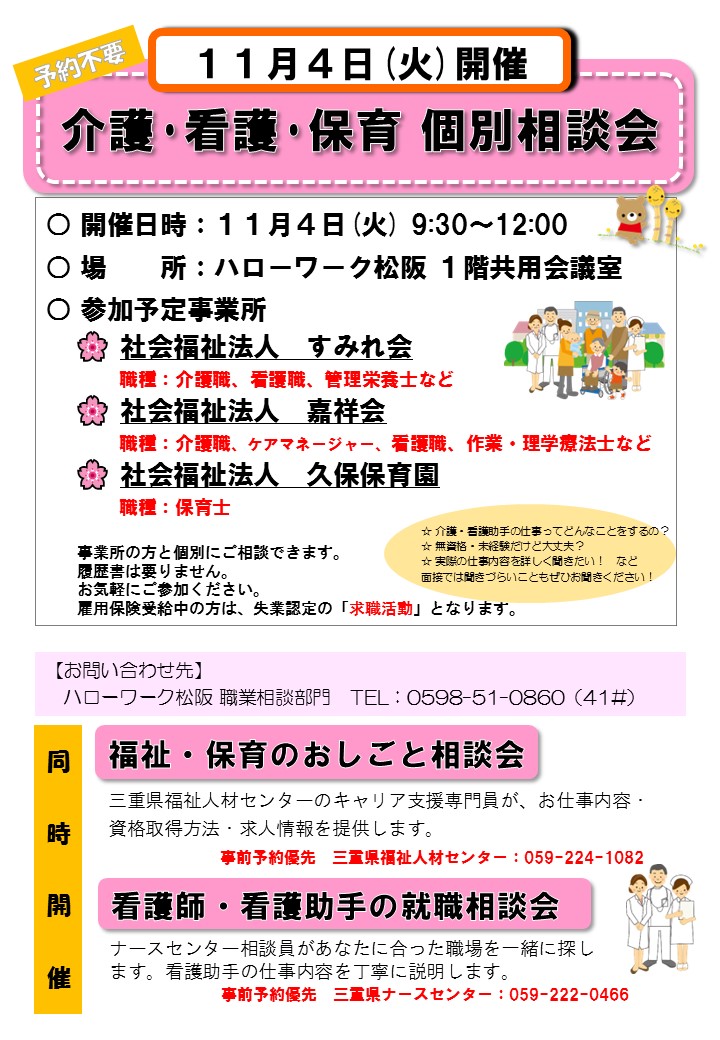 11月4日 介護・看護・保育 個別相談会 開催! 予約不要です!