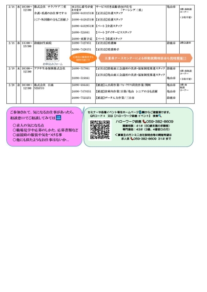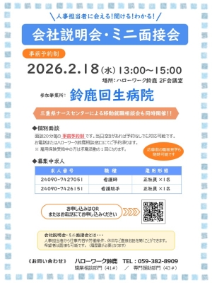 『2/18 鈴鹿回生病院 会社説明会・ミニ面接会』⇒ https://jsite.mhlw.go.jp/form/pub/roudou24/080218form_suzuka