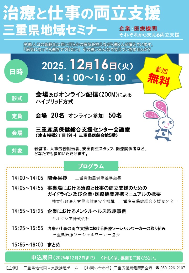 治療と仕事の両立支援の取組の促進を目的として、「治療と仕事の両立支援三重県地域セミナー」を2025年12月16日(火)に開催します。