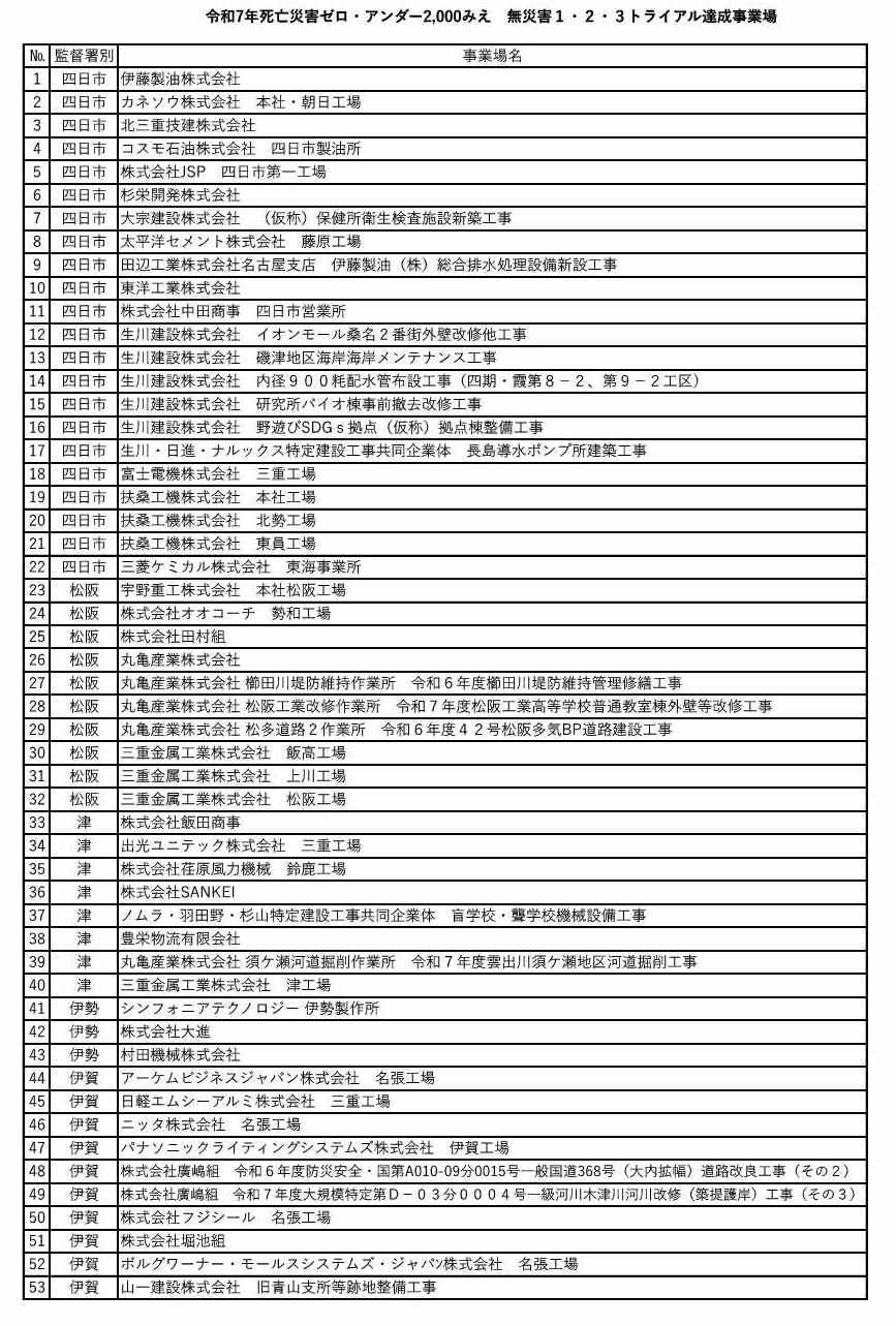 令和7年 死亡災害ゼロ・アンダー2,000みえ「無災害1・2・3トライアル」にご参加いただき、令和7年8月1日から令和7年12月1日までの123日間の無災害の達成に向け、各事業場において創意工夫され、労使一丸となって、さまざまな安全衛生活動に真摯にお取組いただきありがとうございました。