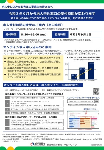 ●令和3年9月1日からハローワークへの窓口来所による求人受付の時間を「8:30~16:00(原則)」に変更させていただいております。