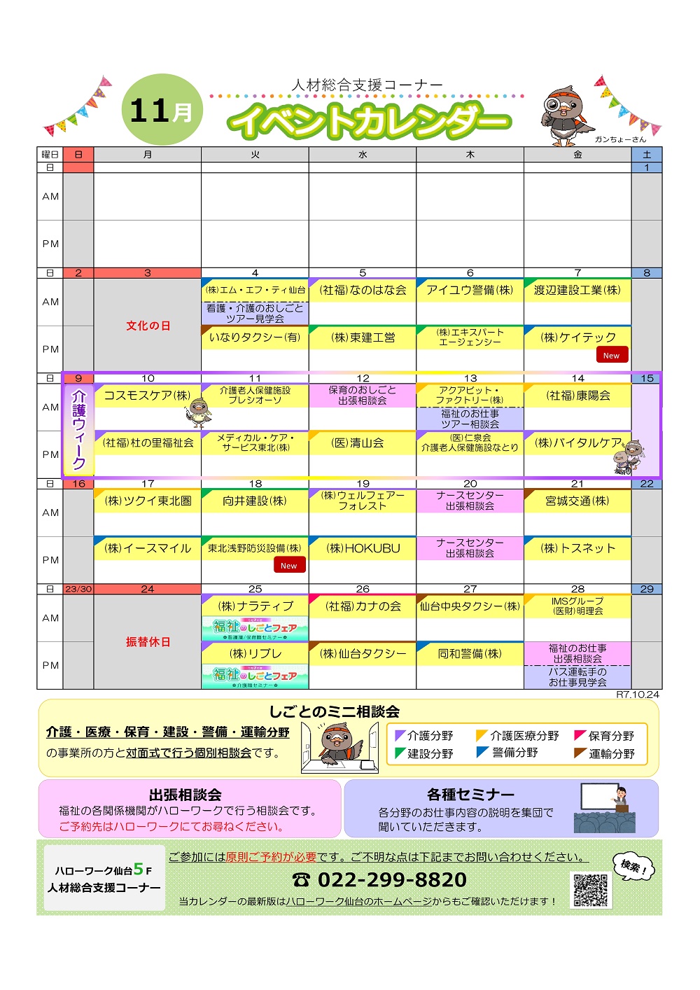 | 7(火) | AM<求職者向け>おしごと見学会【(株)仙台リサイクルセンター】 PM<採用担当者向け>事業主のためのハローワーク活用セミナー(※卸売業・小売業向け)【オンライン形式】 PM<求職者向け>建設業基本セミナー |