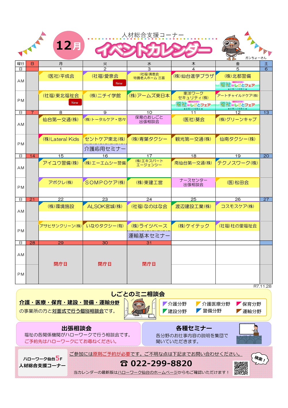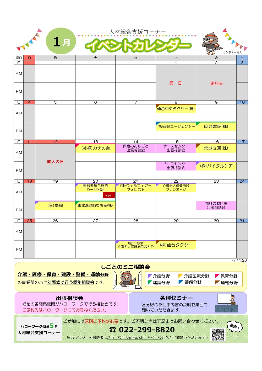 ハローワーク仙台では、介護・医療・保育・建設・警備・運輸の分野でお仕事を希望している方を対象とした