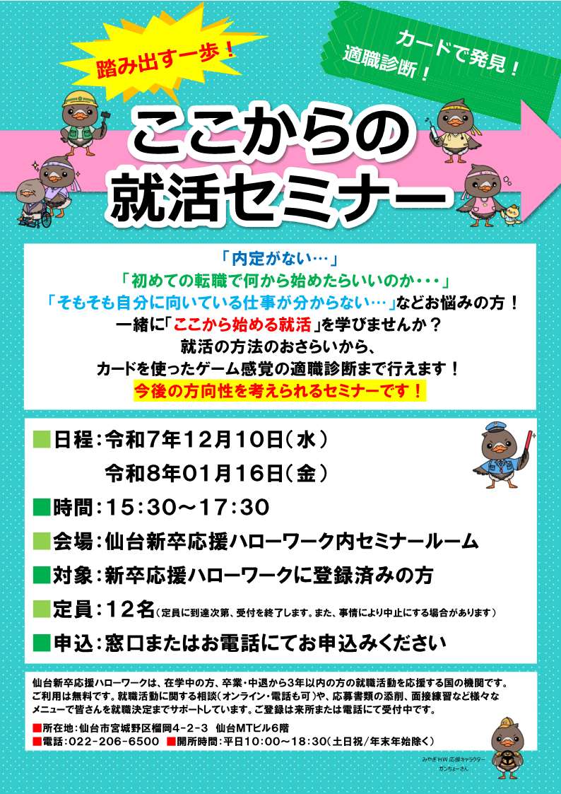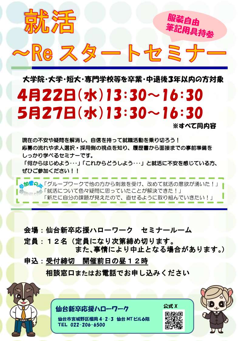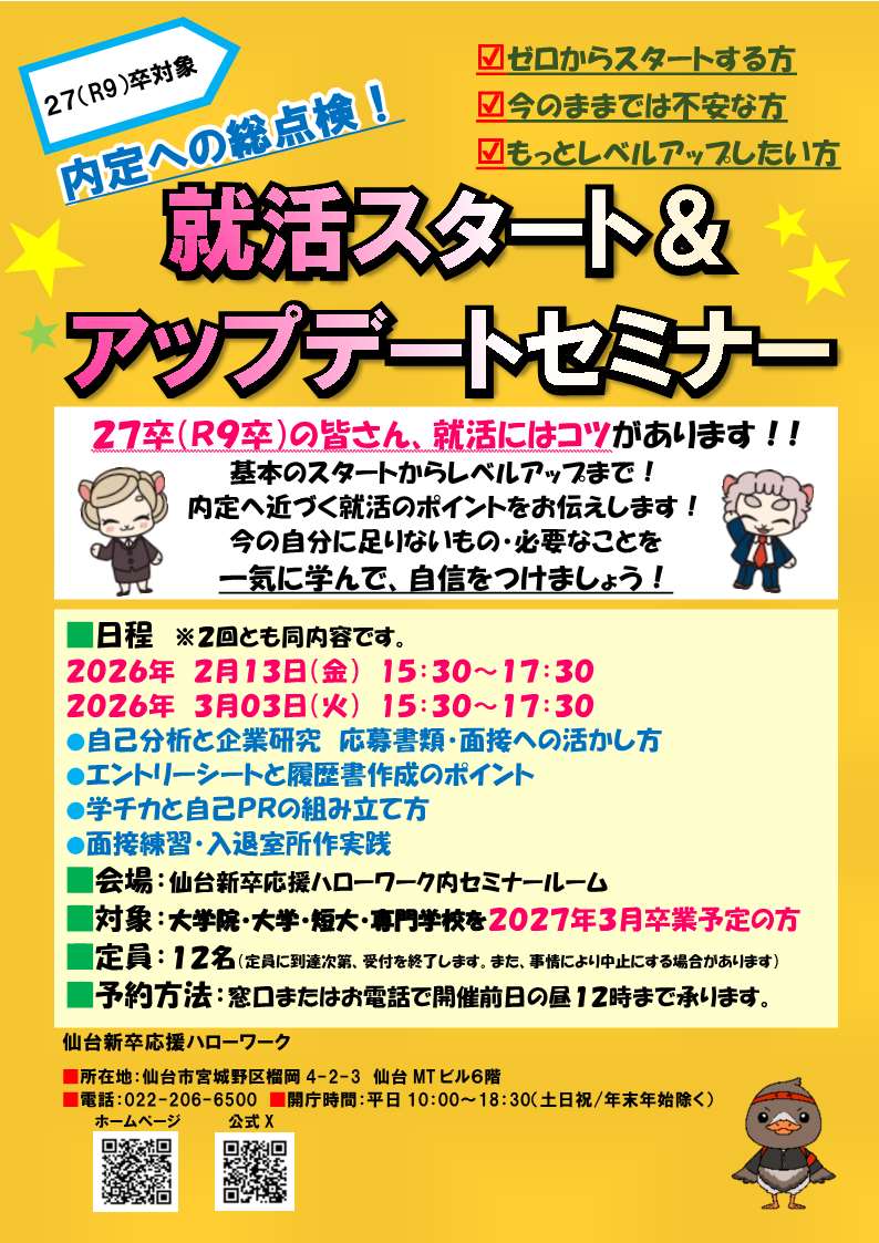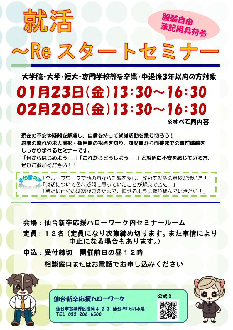 ☆実践的なセミナーを受講して、希望の就職を叶えるための「就活スキル」を習得しましょう! ※人気のセミナーはすぐ満員となるので、早めにお申し込みください。 ※チラシをクリックするとPDF形式データで詳細が確認できます。