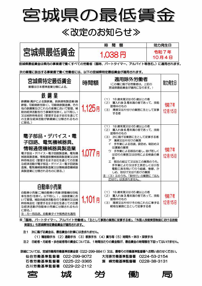 特定最低賃金とは、特定地域内の特定の産業について、関係労使が基幹的労働者を対象として、地域別最低賃金より金額水準の高い最低賃金を定めることが必要と認めるものについて設定されており、宮城県では3件の最低賃金が定められています。