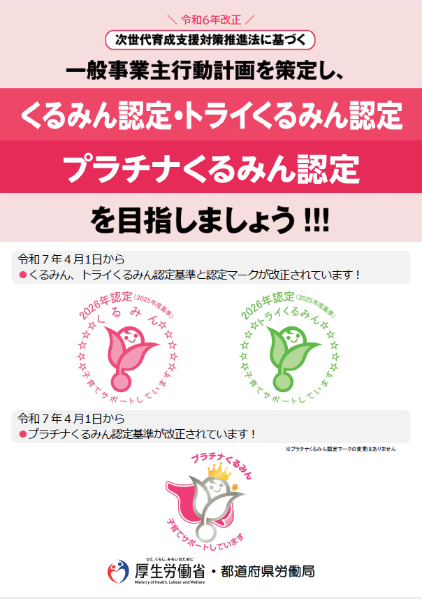リーフレット「次世代育成支援対策推進法に基づく一般事業主行動計画を策定し、くるみん認定・トライくるみん認定・プラチナくるみん認定を目指しましょう!」