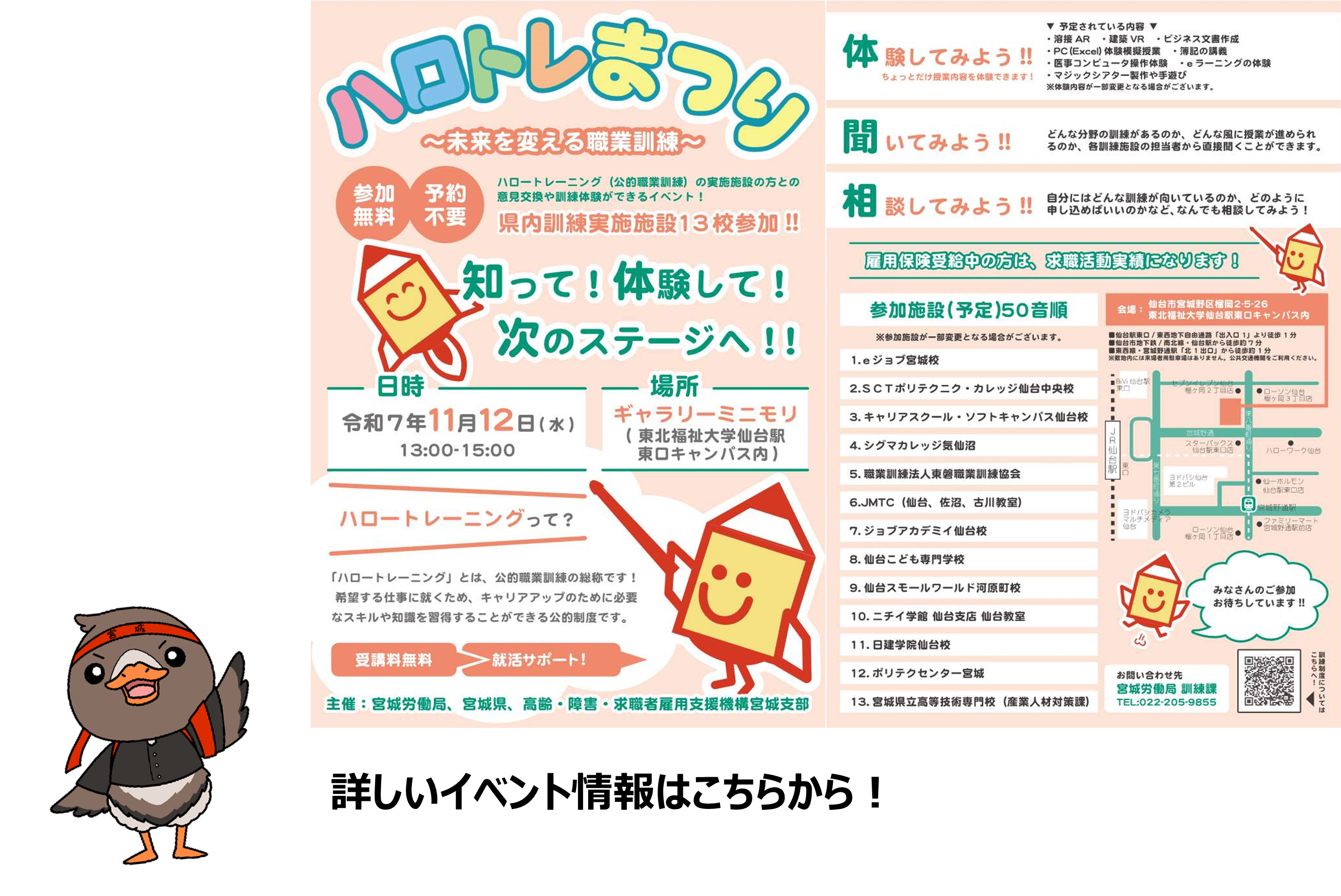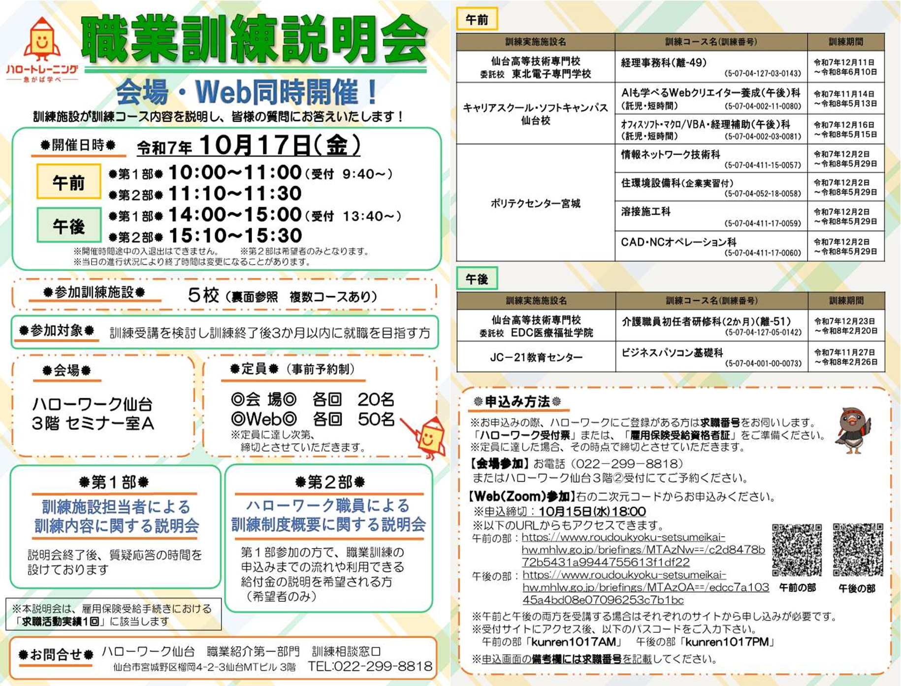 ◎ハローワーク仙台:職業訓練説明会(会場・WEB同時開催)令和7年10月17日(金)