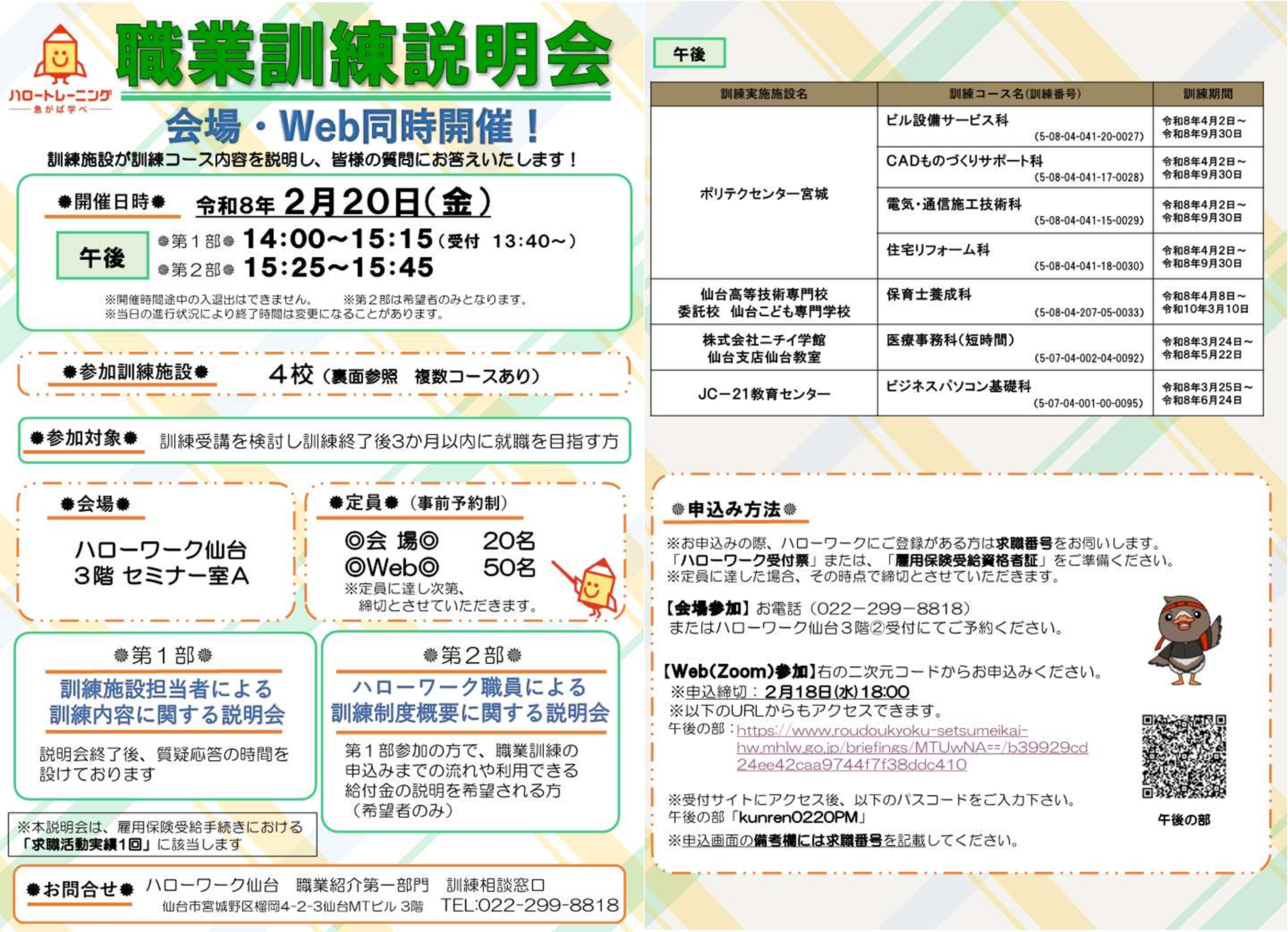(終了)ハローワーク仙台:職業訓練説明会(会場・WEB同時開催)令和8年2月20日(金)