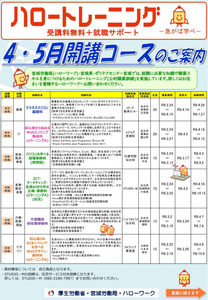現在募集中の宮城県内ハロートレーニング(公的職業訓練)コース情報