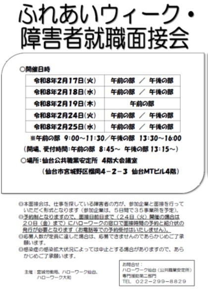 | 仙台会場 | ふれあいウィーク 障害者就職面接会 |